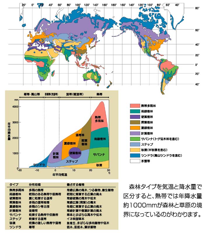 森林はマクロな気候条件,とくに温度・降水量とそれらの季節変動の型によって優占する樹種やその生活形が変化します.緯度の変化とともに気候条件も変化するので,森林タイプもそれに伴って変化します.