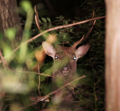 雨で一日順延になったシカライトセンサス.今日は過去最高の8頭を目撃しました.シカの目にはタペタムという光を反射する組織があるので,ライトを当てると写真のように光って見え,昼よりもシカさんを見つけやすくなります.