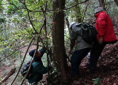 - 継続的に演習林の林分データを蓄積するため,学術参考保護林を設定しています.このサイトではつる植物が特徴的なので,1本1本にラベルをつけています.