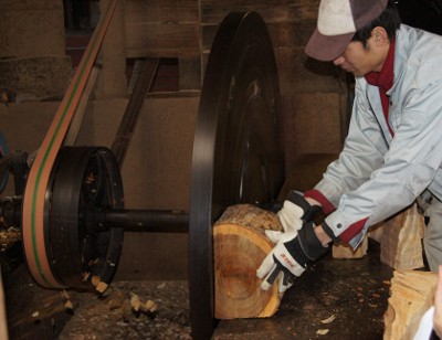 丸太からチップを削りだしているところ