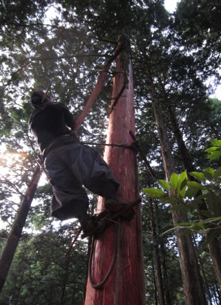 - ヒノキの樹皮は檜皮(ひわだ)とよばれ,日本の伝統的な建築物の屋根を葺く重要な材料として利用されてきました.この檜皮は樹齢80年を超える立木から定期的に採取され,ヒノキは成長を続けます.この持続可能性のある檜皮の形成機構や材質を調べるため,原皮師とよばれる職人さんに依頼して,試験的な剥皮を行いました.